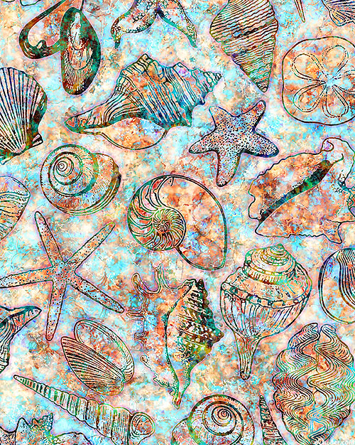 Seashells and starfish resting by the seashore are depicted in vivid hues within stunning sandy & watercolor textures. Digitally printed, larger seashells are about 3-1/2", from the 'Oceana' collection by Dan Morris for Quilting Treasures.