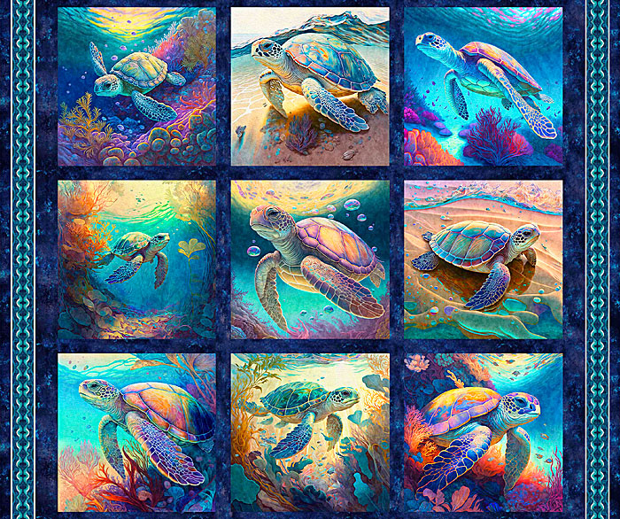 Panel blocks featuring serene scenes of swimming sea turtles coalesce to create a mesmerizing masterpiece of maritime magnificence. Digitally printed, 36" panel, panel has nine frames about 11" x 11", from the 'Endless Blues' collection by Morris Creative Group for Quilting Treasures.