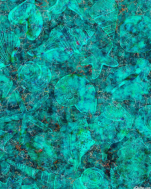 Seashells and starfish resting by the seashore are depicted in vivid hues within stunning sandy & watercolor textures. Digitally printed, larger seashells are about 3-1/2", from the 'Oceana' collection by Dan Morris for Quilting Treasures.