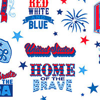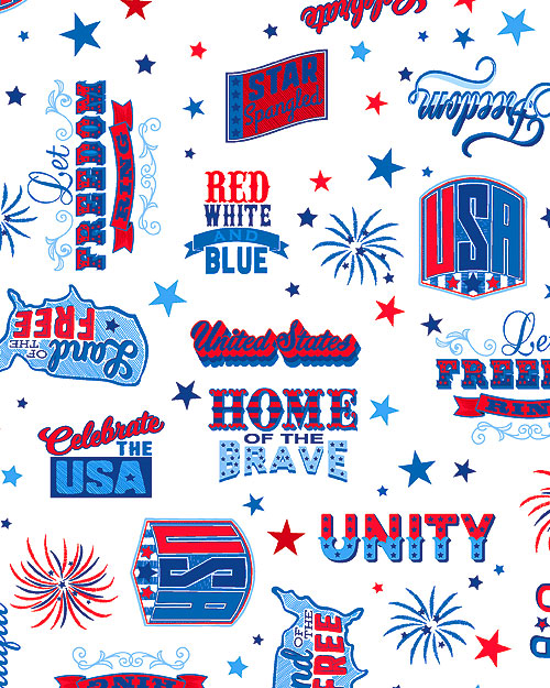 A patriotic parade of American-themed signs and slogans are scattered across the design. Larger signs are about 2-1/2", 'Let's Celebrate Words' from the 'Celebrate The USA' collection by Kanvas Studio for Benartex Fabrics.