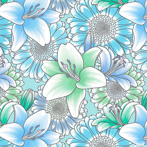 A lush landscape of flourishing flowers coalesce to create a captivating garden gala of texture and tone. Larger flowers are about 5", 'Lilies' from the 'Begins With Mum' collection by Quilt In A Day for Benartex Fabrics.