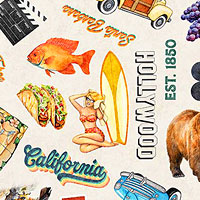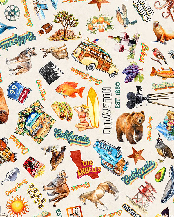 Digitally printed, larger objects are about 3", from the 'California Dreaming' collection by Dan Morris for Quilting Treasures.