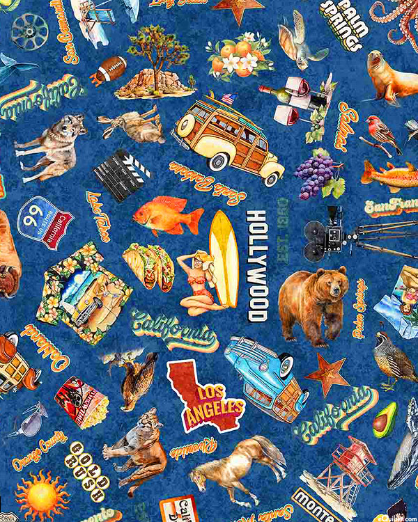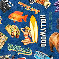 Digitally printed, larger objects are about 3", from the 'California Dreaming' collection by Dan Morris for Quilting Treasures.