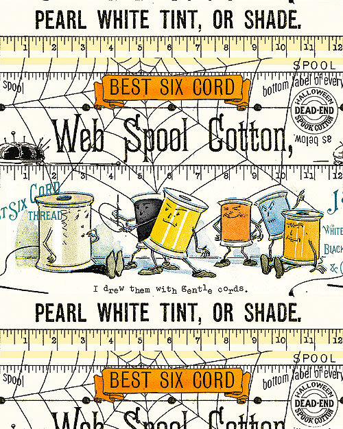 A vintage advertisement for materials used in Halloween costumes evokes a spooky sense of elegance and charm. Digitally printed, wider stripes are about 5-3/4", from the 'Scary Scraps' collection by J. Wecker Frisch for Riley Blake Designs.