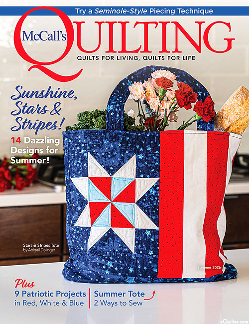 In this issue, explore fun summer projects and patriotic themes in bold red, white and blue and warm summer colors. Projects include: Broad Stripes & Bright Stars by Heather Davis; Red, White, & Blessed by Krisanne Watkins; Rustic Stars by Pooja Garg; Patriotic Parade by Kari Mathews; Patriot's Home by Vicki Bellino; Solstice Blaze by Lyndsey Eisenhardt; Streaming Stars by Lyn Brown; Harborview by Kathryn LeBlanc; Nellie's Star by Anita Peluso; Seminole Style Straps by Gigi Levsen; Stars of the Old West by Nancy Rink; Stars & Stripes Tote by Abigail Dolinger; Red, White & Boom by Tiffany Newton; Foldover Clutch by Mallory Hill; Freedom Waves by Carole Carter; Silhouette by Kari Nichols. McCall's Quilting Magazine - Summer 2026.