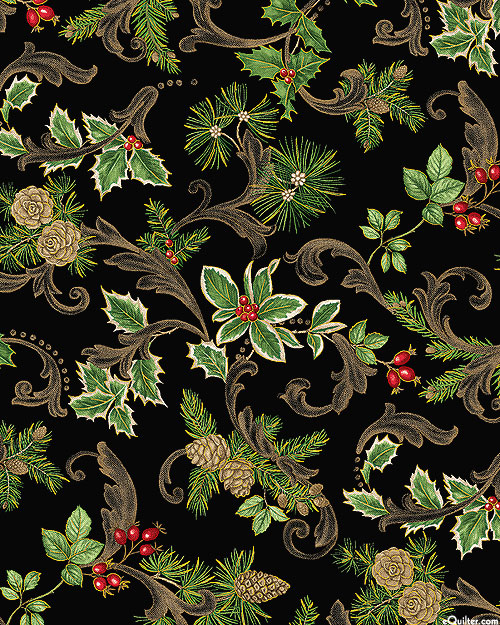 A merry mix of holly and pine sprigs are scattered across this fun and festive design between elegant floral scrolling. Larger scrolls are about 3-1/2", with gold metallic, 'Magic Scroll Pine' from the 'Winter In The Pines' collection by Jackie Robinson for Benartex Fabrics.