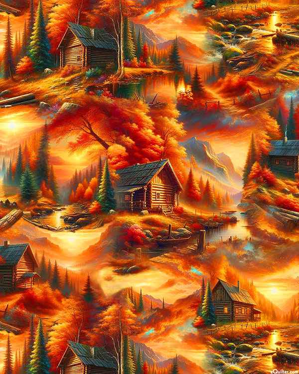 A cozy cabin rests in the middle of a golden forest glimmering in the warm light of a mountain sunrise. Digitally printed, from the 'Homestead Heritage' collection by Marilyn Lee for Blank Textiles.