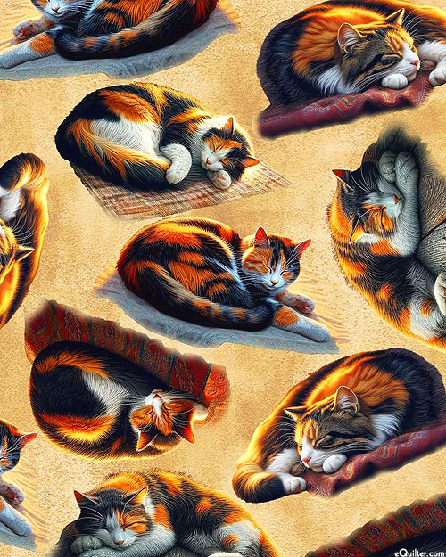 A cozy congregation of cute kitties napping on fluffy blankets are depicted against mottled background in this adorable cat-lovers design. Digitally printed, from the 'Homestead Heritage' collection by Marilyn Lee for Blank Textiles.