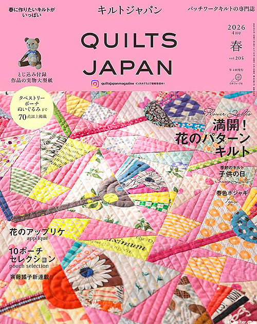 This high-quality 138-page glossy Japanese magazine contains beautiful photographs and illustrations, helpful project diagrams, and pattern inserts. This issue is full of spring inspired projects: beautifully colored patchwork patterns, appliqué quilts & bag pattern, a spring color study, a patchwork plush toy and a machine quilt dress by Sachiko Sasakura. In addition, you will be able to browse coverage of the 9th Quilt Japan Contest Exhibition with an introduction and recruitment information for the 10th. Enjoy a number of serialized projects and articles by well-known quilt artists such as Sachiko Nishiyama, Keiko Miyauchi, Atsuko Matsuyama and Hikari Noguchi. Quilts Japan Magazine - April, 2026 - Text is in JAPANESE.