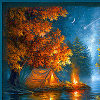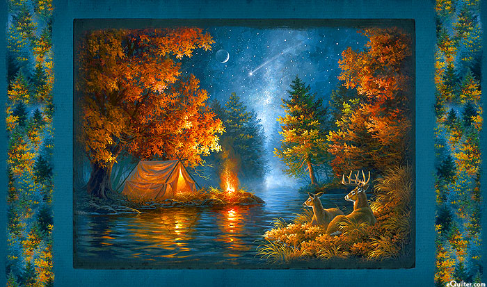 A cozy camping scene comes to life in this panel as a warm campfire illuminates a tent seen across the river from a pair of deer. 24" panel, from the 'Fireside Serenity' collection by Abraham Hunter, Courtesy of MHS Licensing, for P&B Textiles. For home sewing only, not for resale.