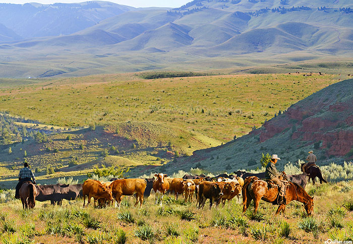 A group of ranchers herd their cattle in the high country, with green pastures and rolling mountains providing a grand background. Digitally printed, 31" panel, from the 'On the Range' collection by Hoffman Fabrics.
