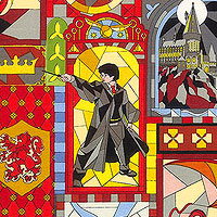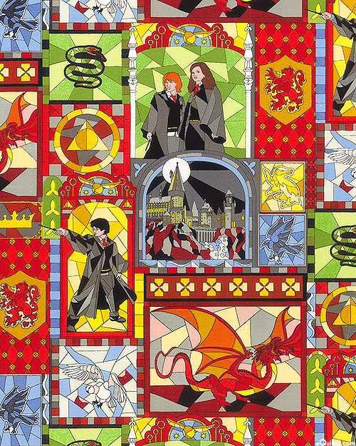 Harry Potter, Hermione Granger, and Ron Weasley are pictured in this stained glass design, along with the four houses of Hogwarts. Larger frames are about 5", 'Stained Glass Windows' from the 'Wizarding World - Harry Potter' collection by © Warner Bros. for Camelot Fabrics. For sale in North America only, for noncommercial home use only.