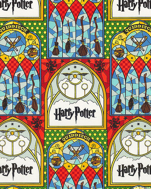 The game of Quidditch is on display with flying brooms and a Golden Snitch in this stained glass window print. A favorite of Harry Potter, Hermione Granger, and Ron Weasley. Larger frames are about 7", 'Stained Glass Windows' from the 'Wizarding World - Harry Potter' collection by © Warner Bros. for Camelot Fabrics. For sale in North America only, for noncommercial home use only.