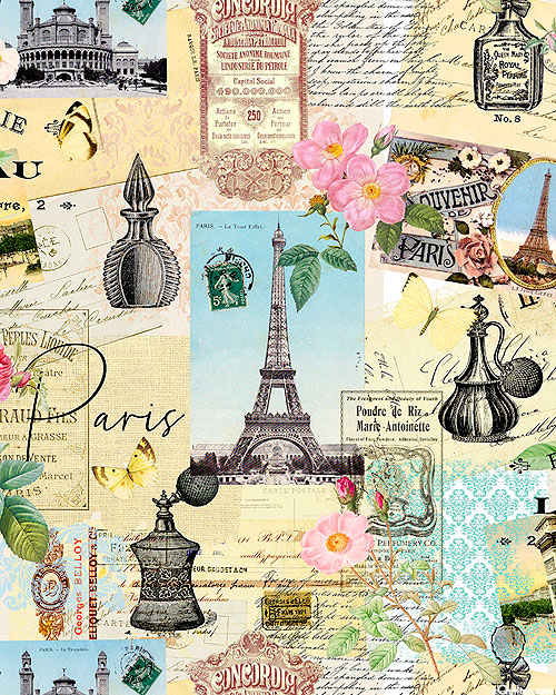 A collage of various Parisian items are scattered across the design including postcards, photos, and elegant handwritten letters. Digitally printed, larger post cards are about 6", 'Paris Collage' from the 'Belle Fleur' collection by Timeless Treasures.