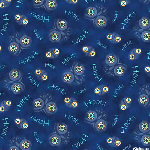 Glowing eyes of owls peer out from the dark as the phrase "Hoot!" is printed between. Digitally printed, larger owls are about 1", from the 'Opulent Owls' collection by Marjorie Sarnat for Quilting Treasures.
