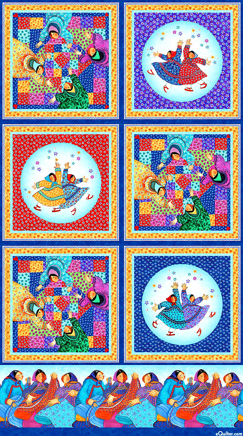 Communities of Inuit women come together to dance and work together to make quilts. Digitally printed, 24" panel, panel has six frames about 11-1/2" x 11-1/2", from the 'Quilts and Kuspuks' collection by Barbara Lavallee, author of "Mama Do You Love Me?", for Northcott Fabrics.