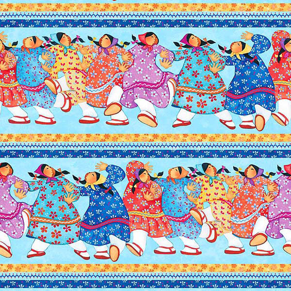 Joyful Inuit women dance together with their arms linked. Nothing compares to the sisterhood of those you dance with. Wider stripes are about 4-1/2", stripes run the length of the fabric, from the 'Quilts and Kuspuks' collection by Barbara Lavallee, author of "Mama Do You Love Me?", for Northcott Fabrics.