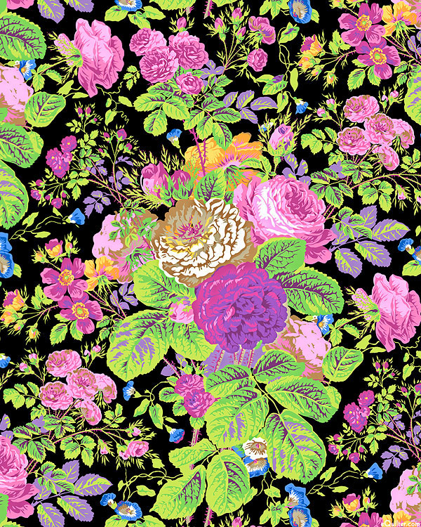 A grand bouquet of garden roses tumbles over a solid ground in this splendid display of blooms and leaves. Filled with rich colors, this large scale design has all the romance of the old fashioned rose blazing with contemporary hues. Larger flowers are about 5", 'Gradi Floral' from the 'Kaffe Fassett Collective February 2025' collection by Kaffe Fassett for Free Spirit. Because of the large repeat, please order a minimum of 1 yard to receive a full repeat of the design.