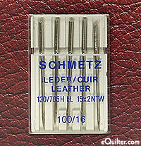 Schmetz Leather Needles have a cutting point that will easily penetrate even the toughest leather for trouble free sewing! Perfect for leather, artificial leather and heavy non-woven synthetics. Do not use on knit or woven fabrics. Schmetz Leather Sewing Machine Needles, sold in sets of 5, size 100/16, from Schmetz.