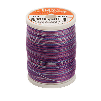 These exciting new multicolor threads from Sulky are a masterful blend of different colors within the same range of tone and intensity, with random, subtle color changes every 2-1/2 to 5 inches! Blendables add depth and dimension to freemotion embroidery, fashion sewing and home dec projects. Made of the highest quality, long-staple, 100% Egyptian Cotton on snap-end King Spools. Ideal for quilting, thread lace, bobbin work, thread painting, red work and decorative embroidery. Recommended Needles: 100/16 jeans or topstitch. Sulky Blendables, 300 yard 12wt. king size snap-spools, color #4032, Sulky Color: Iris.
