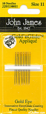 These high-quality needles are perfect for patchwork, general sewing, and appliqué. An 18k gold plated eye and the Easy-Glide coating make threading a breeze, and stitching through multiple layers fast and easy with less strain on hands. John James needles are a favorite of quilters everywhere, because of their high quality. Package of ten Gold'n Glide needles, size 11 'Applique'.