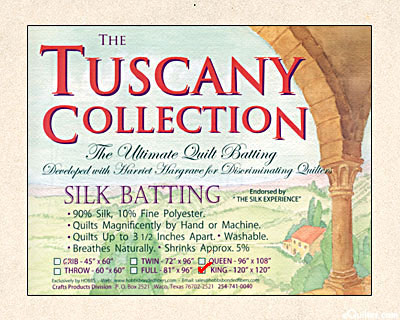 Tuscany silk bonded batting is made from fine, pure, imported silk filaments to which 10% polyester has been added. Because of silk’s natural ability to breathe, it is an excellent choice for airy, lightweight quilts and garments. This premium batting quilts magnificently by hand or machine and allows quilting up to 3 1/2" apart. Developed by Harriet Hargrave for the discriminating quilter. Washing instructions: hand wash in tepid water and line dry; it may shrink up to 5%. Carded, resin bonded, and breathes naturally. 120" x 120", 90% silk, 10% fine polyester blend batting, from The Tuscany Collection by Hobbs. Manufactured in the United States.
